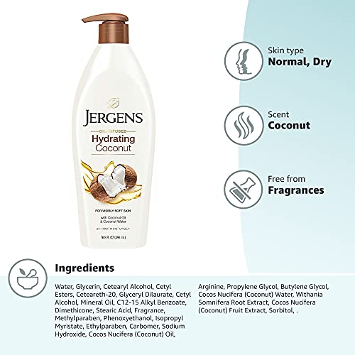 Jergens Hydrating Coconut Body Lotion, Hand and Body Moisturizer Hydrates Dry Skin Instantly, Infused with Coconut Oil, Dermatologist Tested, 16.8 oz