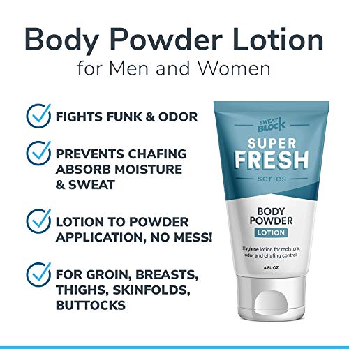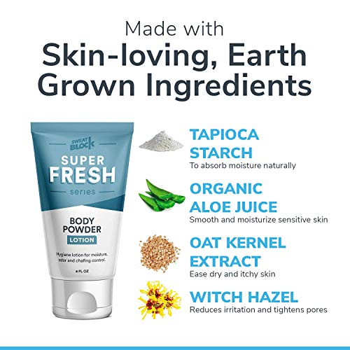 Super Fresh Body Powder Lotion by SweatBlock – Talc Free, Anti-Chafing, Deodorizing, Natural Ingredients – No Mess Body Powder Lotion for Men and Women – 4 fl oz.