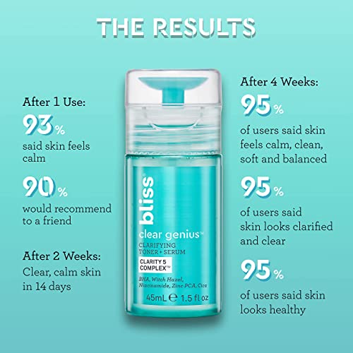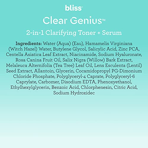 Bliss Clear Genius Clarifying Toner + Serum | Purifies Pores, Tones, Calms & Clears Skin | with Salicylic Acid, Niacinamide & Witch Hazel | Clean | Cruelty Free | Paraben Free | Vegan | 4.3 oz