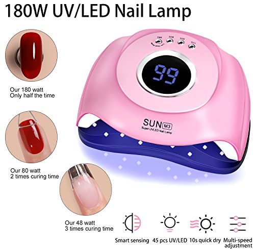 - FAST CURING LAMP: 45 PCS lamp beads totally with 180 watts illuminate your gel nails in all directions. The size of the UV light is large enough to hold your fingers and toes. More efficient than other common nail lights, 50% less than the average drying time. Quickly curing of all types of uv gels, extension gels, led gels, nail builder gel, nail sculpture gel.