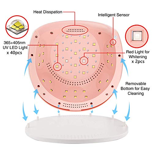 - High performance with two light sources – 2 pcs whitening LED beads for reducing hands from blackening; 40 pcs UV LED beads for curing gel nail polish evenly. 50000 hours useful time with 84W power suitable for drying all kinds of gel nail polish quickly and efficiently.